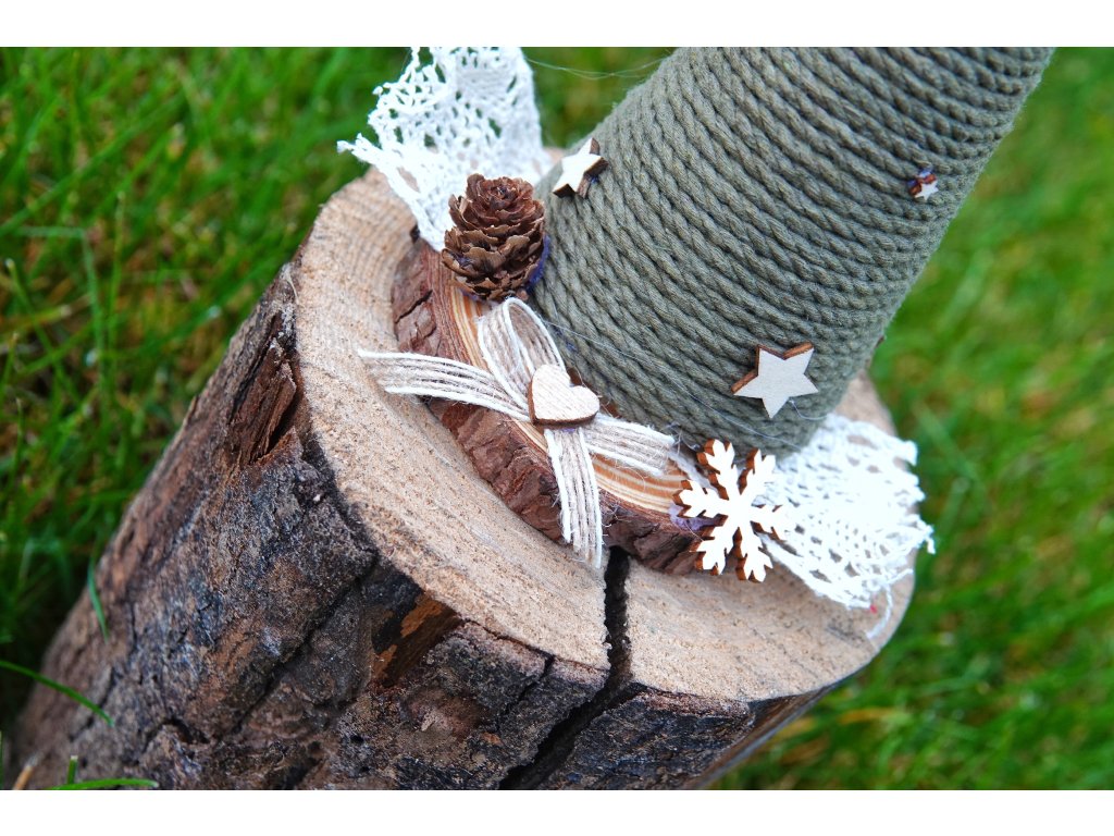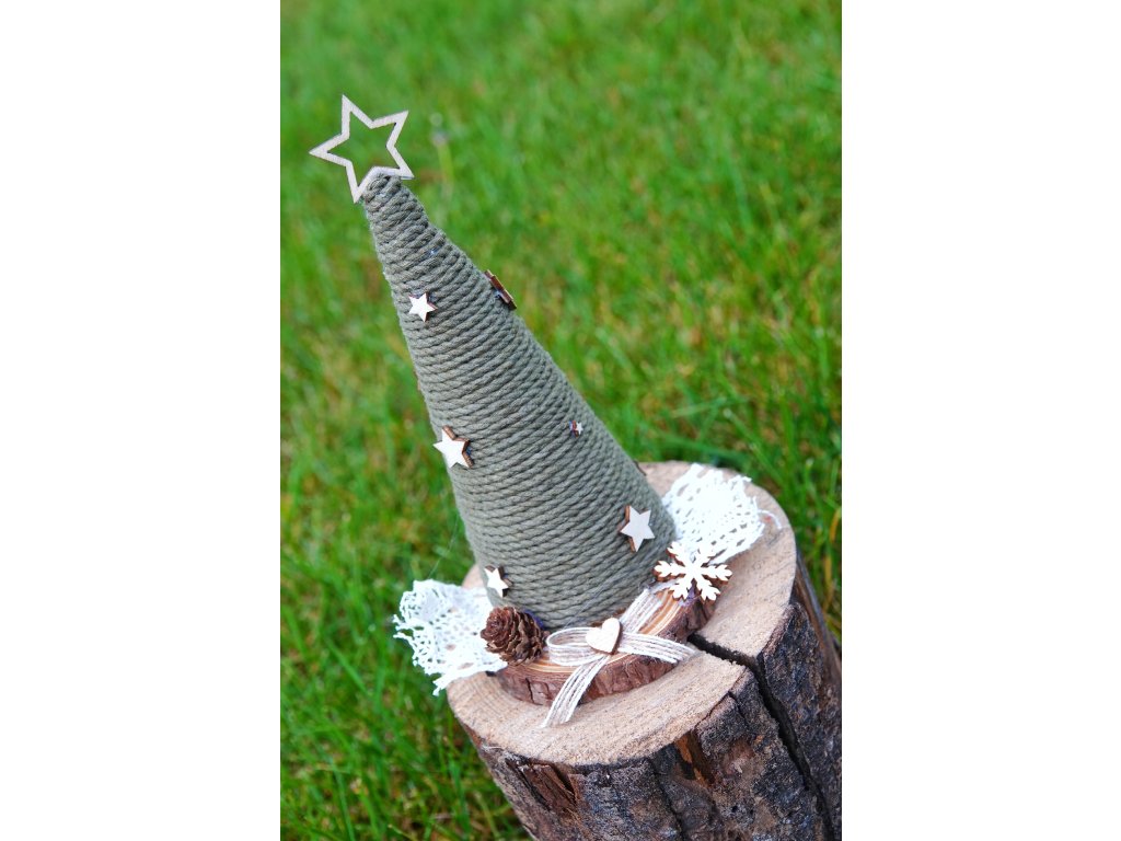 Dekorace vhodná do interiéru. Vánoční stromeček je zapleten z trojitě stočené macramé šňůry, doplněn o přírodní dřevěné prvky, šiškou, krajkou a jutovou stuhou. Stromeček je dozdoben výřezem ve tvaru vločky.