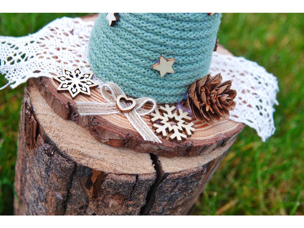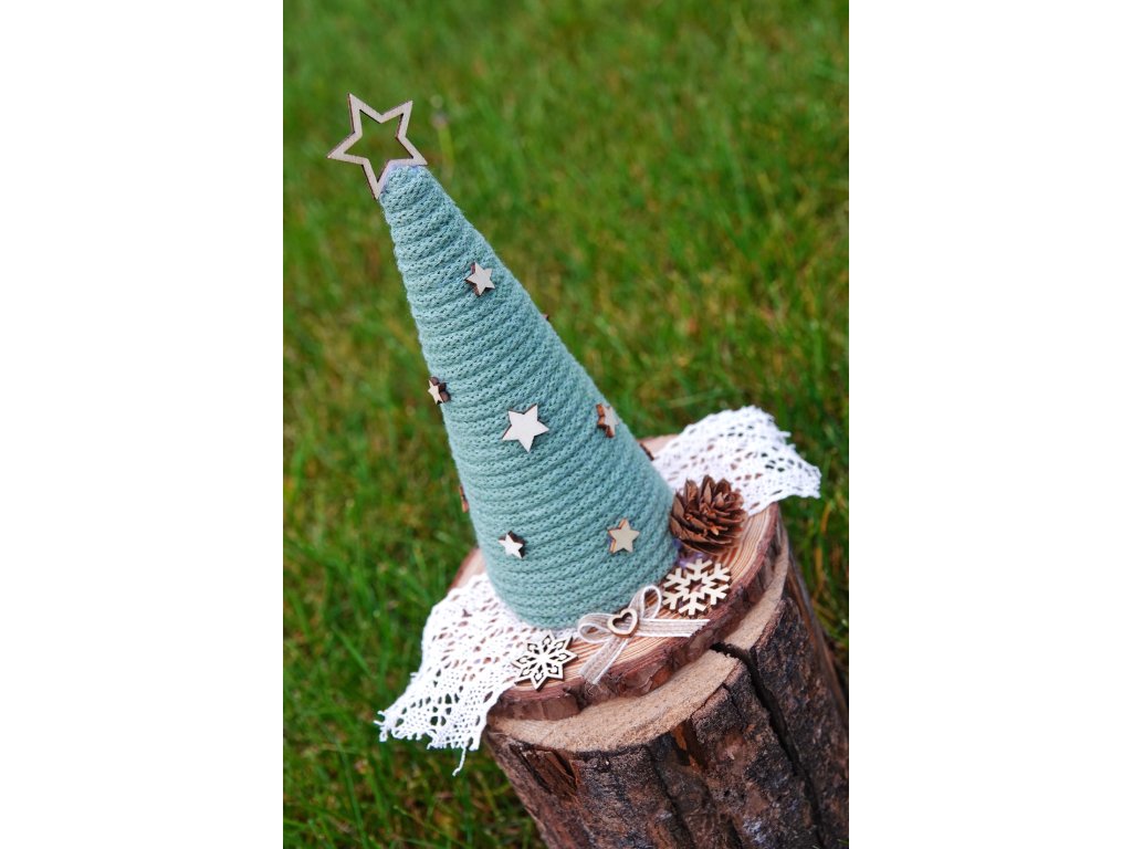Dekorace vhodná do interiéru. Vánoční stromeček je zapleten z bavlněné macramé šňůry, doplněn o přírodní dřevěné prvky, šiškou, krajkou a jutovou stuhou. Stromeček je dozdoben výřezem ve tvaru vločky.